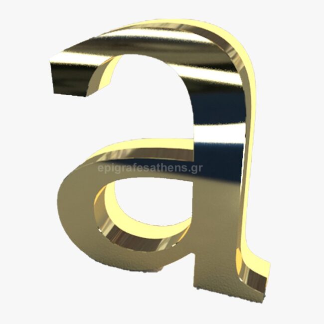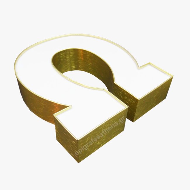 MIRROR GOLDΜεταλλο-ακρυλικό φωτειζόμενο γράμμα με πρόσθιο φωτισμό LED Thickness: 0.6mm / 0.8mm Color: Mirror Gold Size: 6cm / 8cm / 10.8cm / 12cm Plexiglass white 3mm & LED Samsung Letter minimum height: 10cm