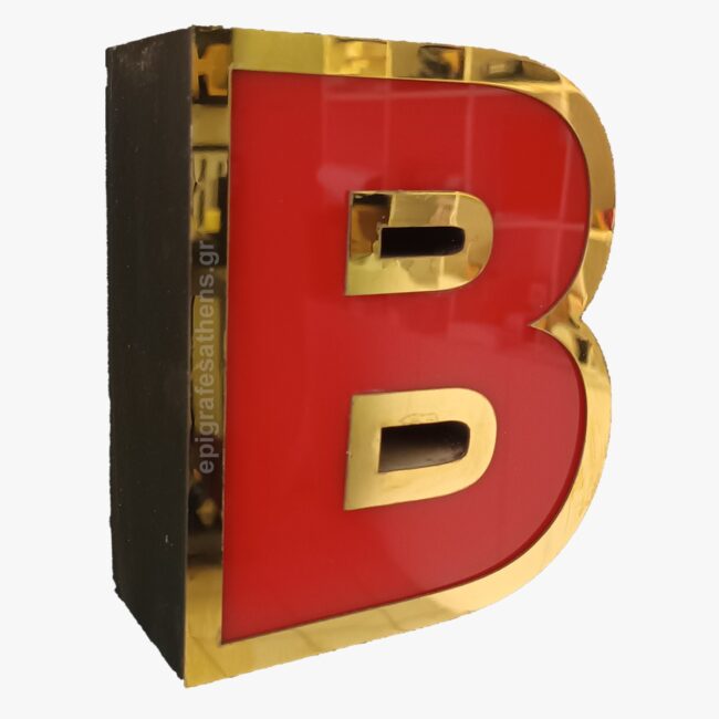 MIRROR GOLDΜεταλλο-ακρυλικό φωτειζόμενο γράμμα με πρόσθιο & κρυφό φωτισμό LED Thickness: 0.6mm Color: Mirror Gold Size: 6cm Plexiglass red 3mm & LED Samsung Letter minimum height: 10cm