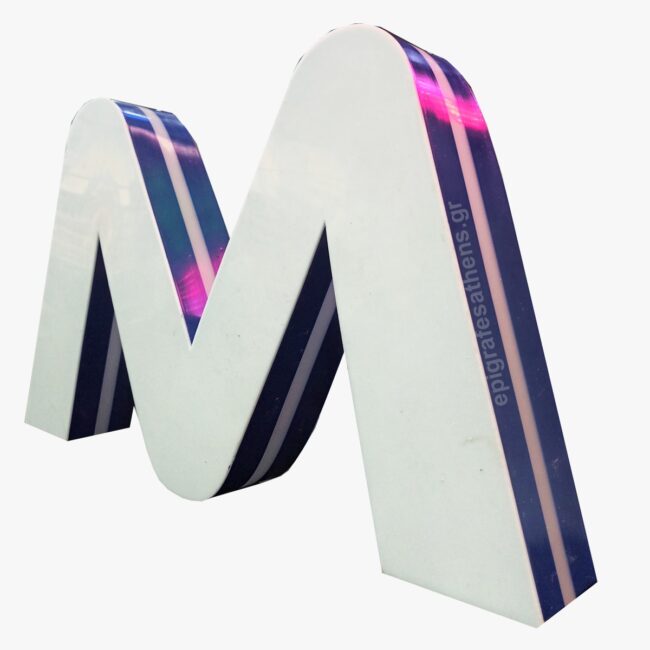 MIRROR SILVERΜεταλλο-ακρυλικό φωτειζόμενο γράμμα με πρόσθιο & κρυφό φωτισμό LED Thickness: 0.6mm / 0.8mm Color: Mirror Silver Size: 6cm / 8cm / 10.8cm / 12cm Plexiglass red & LED Samsung Letter minimum height: 10cm